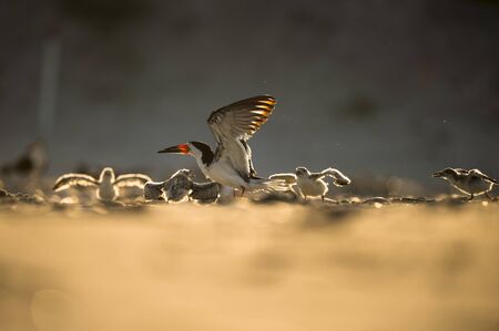 A Black Skimmer is surrounded by chicks on a sandy beach as it glows in the golden morning sunlight.