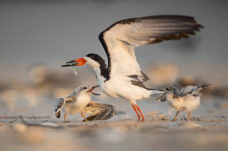An adult Black Skimmer is attacked by its two chicks on the beach as it returns with a fish to feed them.