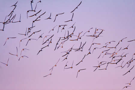 A flock of black-winged stilt relaxing on a lake during great migration in Asia. Migratory wild birds. Bird migration. Selective focus.