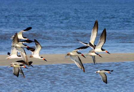 Flock of Black Skimmers in flight over the ocean