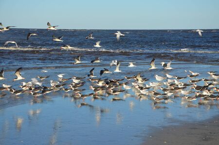 Flock of shore birds on the beach - terns, skimmers and seagulls