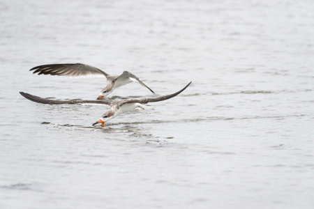 Flying black skimmer terns Rynchops niger over the water of Clam Pass in Naples, Florida.