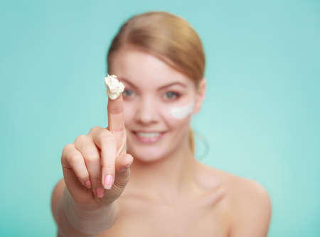 Beauty treatment. Woman applying moisturizing cream skin care product on face studio shot on green blue background