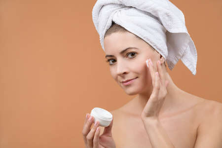 Beautiful woman with short haircut applying anti aging moisturizer on her face. Beauty and skin care concept on light brown background.