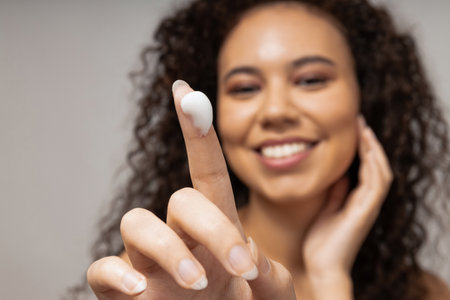 Beauty portrait of young african american woman applying cosmetic cream on face.