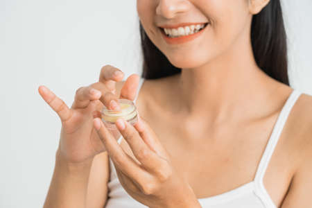Close up of young Asian woman applying moisturizer cream on her face. Conceptual of beauty and skin care.