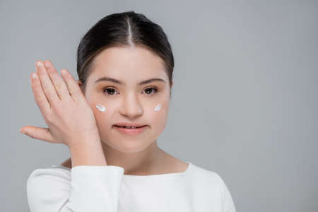 Positive woman with down syndrome and face cream isolated on grey