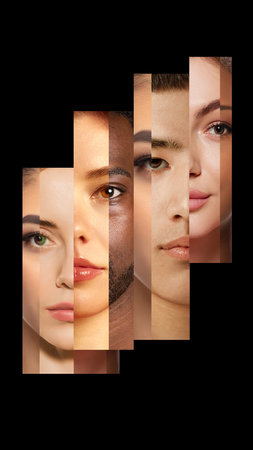 Collage made of portraits of different young men and woman representing a different ethnicity and skin tone.