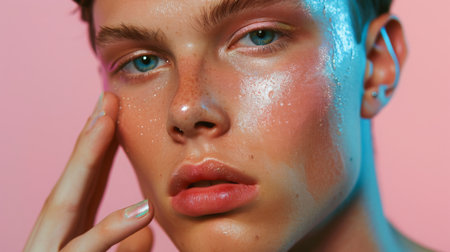 Unusual portrait of a guy in makeup. Fashionable portrait. Art photo processed with the addition of noise. The noise is not chamber.