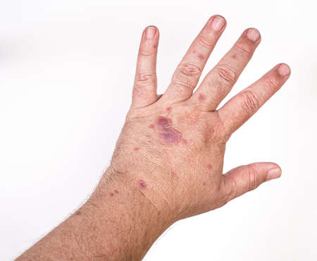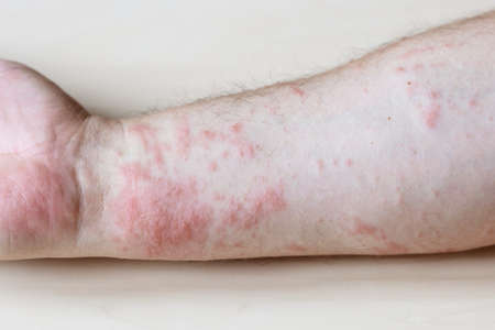 Patient showing arm and hand with red itchy painful rash. Allergic symptom on male hands. Dermatology, skin care. White background, top view