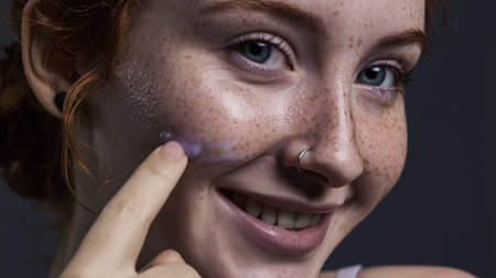 Beautiful model-like girl with piercing spreading purple moisturizing cream on her cheek. Facial skincare concept.