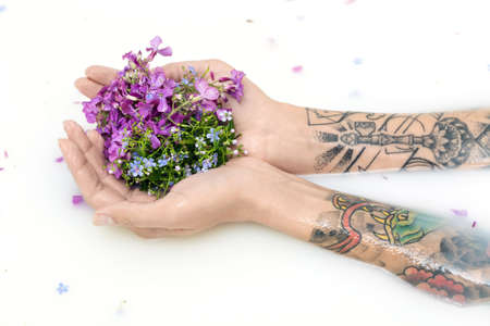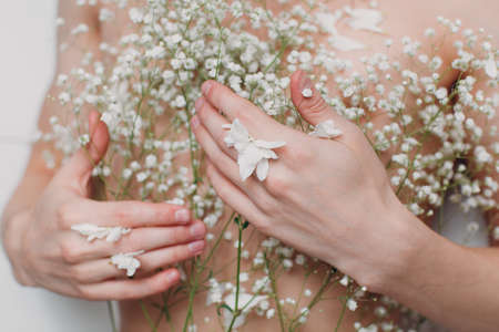 Spring wild flowers and naked beautiful breast close-up. Tender nature and woman body