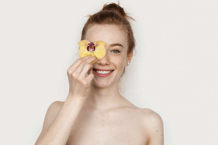 Smiling caucasian lady with red hair and freckles covering eye with a flower and posing with naked shoulders at camera on a white studio wall