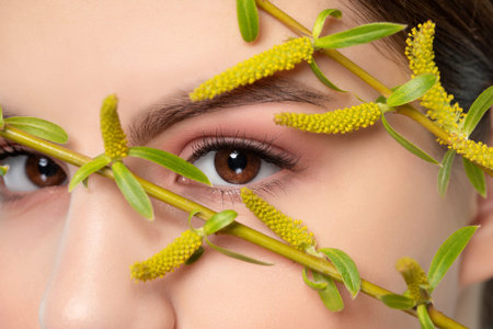 Young girl with beautiful nude make-up, thick eyebrows.Beautiful hazel eyes close up. Near her are beautiful blooming willow branches.Looking at the camera.Professional makeup and cosmetology