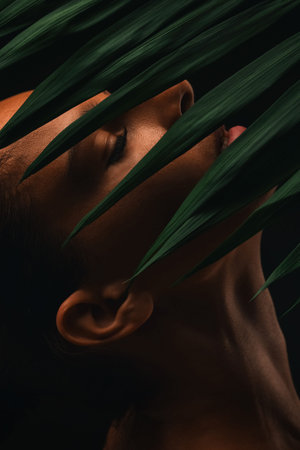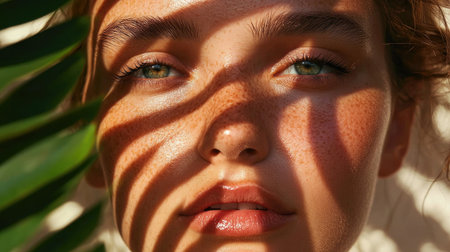 Stunning portrait of a woman with sparkling makeup and natural leaves. The interplay of light and shadows creates an enchanting atmosphere. Perfect for beauty or nature themes.