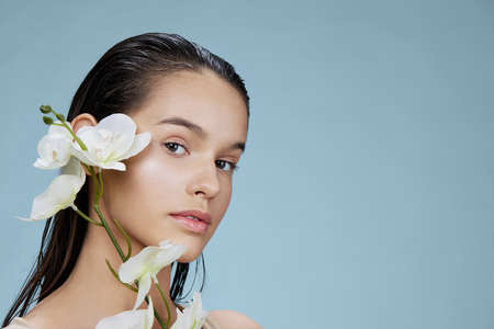 Close up portrait of a beautiful young girl with white flowers in her hair