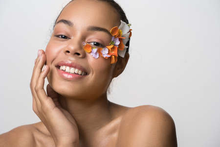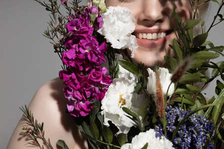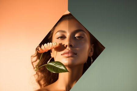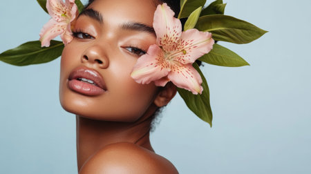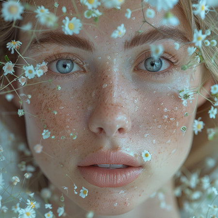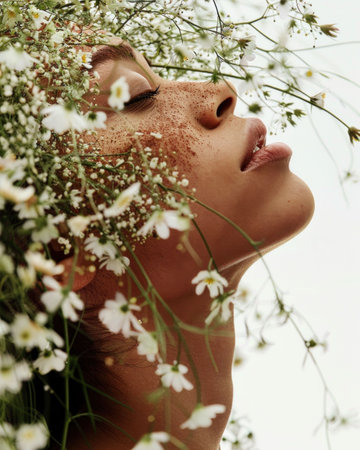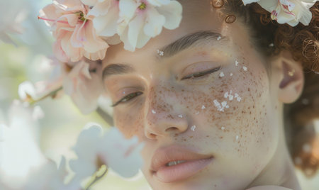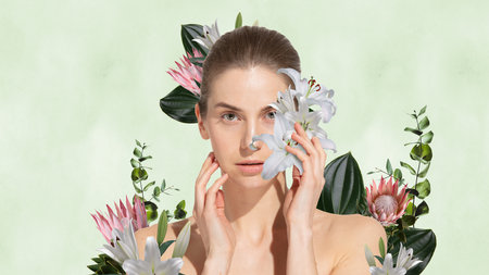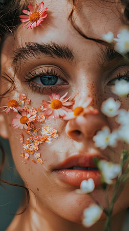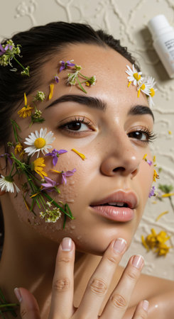 Woman with fresh flowers on face for natural skincare. Holistic beauty and wellness concept. Healthy glow and self-care.