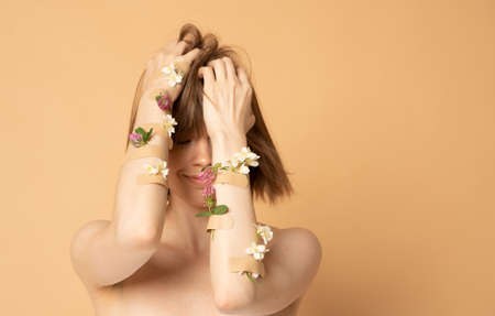 beauty portrait of a girl with flowers glued on a plaster to the body and face
