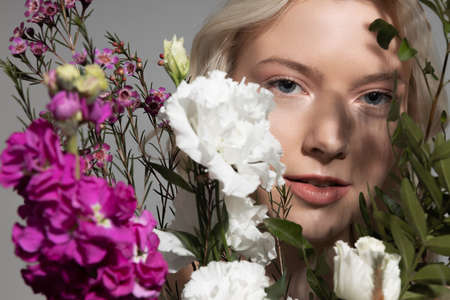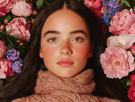 Close-up of a young womans face partially obscured by vibrant flowers, conveying a sense of beauty and nature. Enchanting Floral Gaze. lush summer floral arrangement, captivating gaze. AIG50