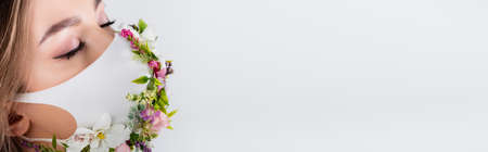 Woman in medical mask with flowers standing with closed eyes isolated on gray, banner