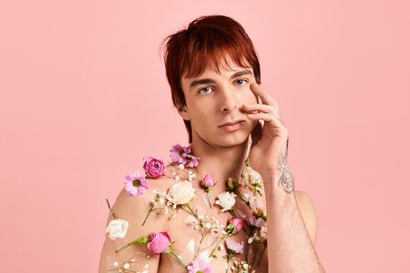 A young man with striking red hair poses confidently in a colorful floral shirt against a neutral pink background.