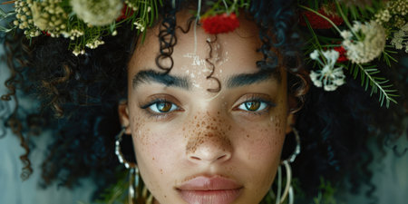 A captivating portrait of a young woman with curly hair adorned with a crown of flowers, showcasing her striking features. Her eyes, a vivid hue, draw attention alongside her freckles that enhance her unique charm. The floral arrangement includes greenery and colorful blooms, creating a harmonious balance with her natural beauty.