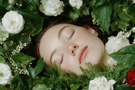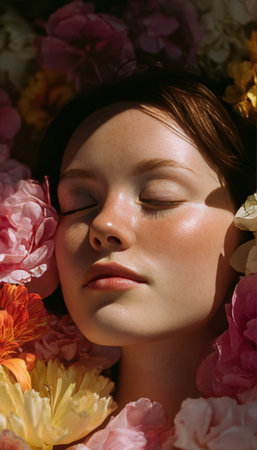 A woman rests peacefully with her eyes closed, surrounded by soft roses. Her face glows gently, revealing tranquility and beauty in a serene natural setting.