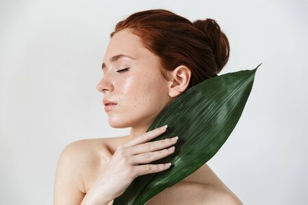 Portrait of a pretty young redhead woman posing isolated over white wall background with leaf green flowers.