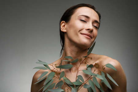 Portrait of topless adult woman posing with eucalyptus and smiling isolated over gray background, eyes shut