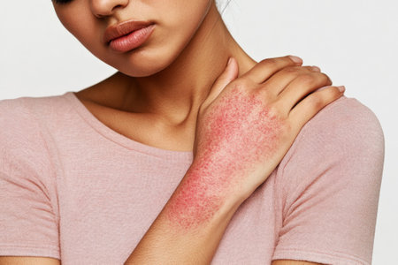 Woman displays red flaky skin on her arm while scratching due to eczema. The close up highlights the conditions impact on her daily life and comfort.