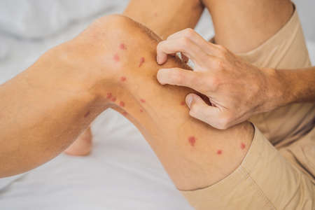 a lot of mosquito bites on mens legs. allergy from a bite on the skin