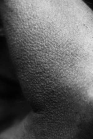 side view of the texture of human pink, irritated skin covered with wrinkles, hairs and blisters from burns and allergies