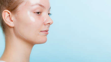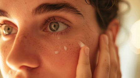 The close up picture of the female is applying face treatment and make up product to give skin freshness, the facial treatment require cleansing, exfoliation, moisturizing and mask application. AIG43.