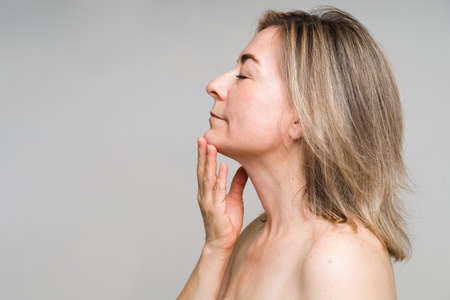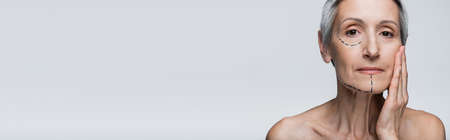 mature woman with wrinkles and marked lines touching face isolated on grey, banner