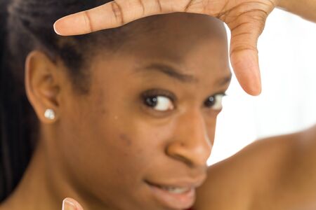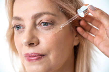 Concept of morning routine procedure. Face portrait of beauty adult african american woman holding pipette with anti wrinkle serum oil under eye isolated on white background with copy space