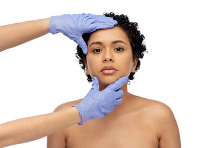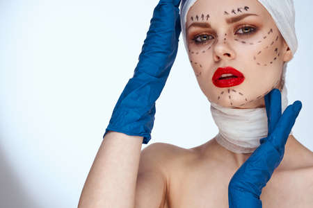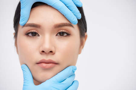 Doctor hands in protective medical gloves. Derma test. Prepare operation consultation. Pretty young woman. Face treatment. Blepharoplasty or rhinoplasty clinic. Cosmetology concept. Banner. Copyspace