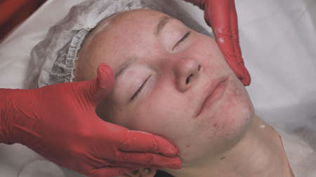 Close up of face of young teen girl with problem skin and acne, lying on the massage table in modern cosmetology clinic. Hands of female doctor beautician in gloves examines the skin of her patient