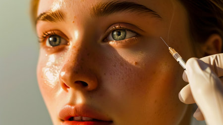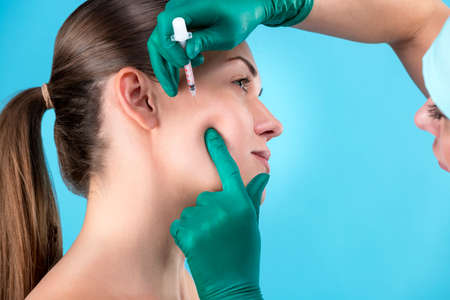 Beautiful woman face and beautician hands with syringe. Doctor makes cosmetic injection. Clean Beauty concept