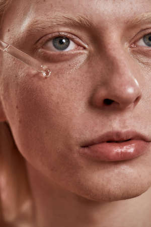 Closeup portrait of handsome guy with smooth skin looking at camera, applying serum beauty product on his face using glass pipette