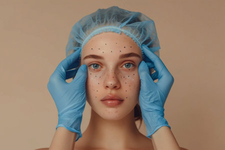 Aesthetic practitioner wearing gloves works on a patient's face, showing cosmetic surgery methods in a clinical environment.