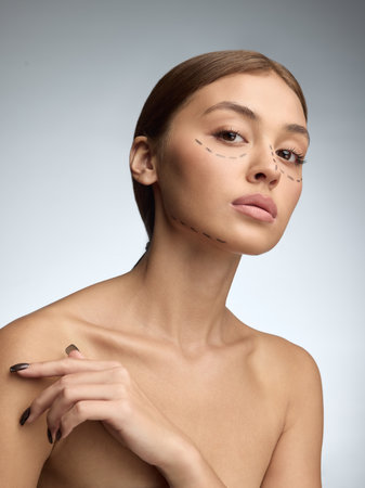 Woman with surgical markings touching shoulder showing confidence precision and self awareness. Concept of beauty transformation, preparation, and modern aesthetic medicine.