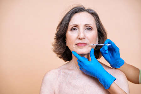 Image of a senior woman getting a beauty treatment. Client of a beauty salon taking a filler injection in the face against wrinkles and aging strokes