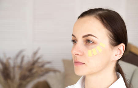 Young woman with kinesiology tapes on face looking away on on a light surface.Face aesthetic taping.Lifting skin concept.