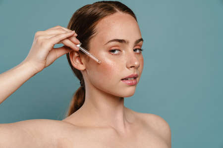 Portrait of a young healthy white topless woman holding pipette of facial oil serum at her face over blue wall background
