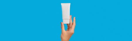 Top view of anonymous female with manicured hand demonstrating blank tube of cream against light blue background