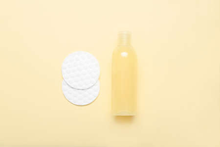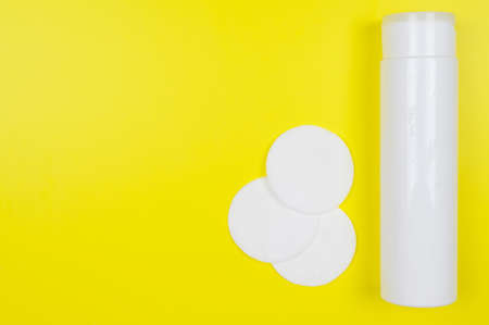 Makeup remover, cotton pads on a yellow background.Layout, copy space,top view