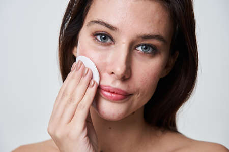 Brunette attractive woman with post acne spots cleaning her face with a cotton pad
