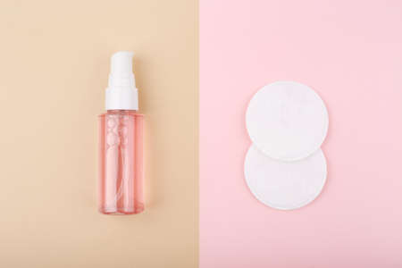 Top view of cleansing foam or gel for make up removing and cotton pads on beige and pink background.