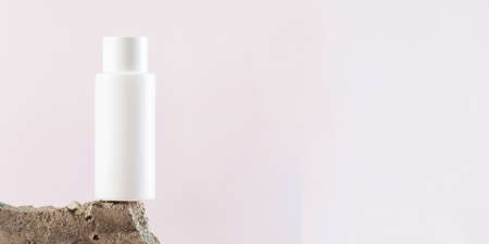 White empty bottle of cosmetics on a concrete podium on a pink background close-up. Copy space.