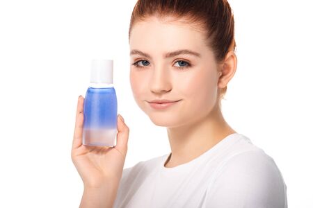 beautiful smiling teen girl with clean skin holding bottle with blue makeup remover, isolated on white